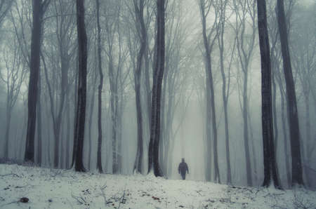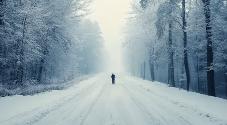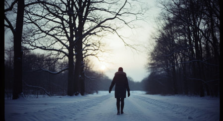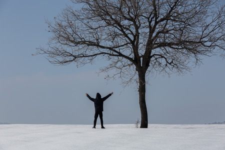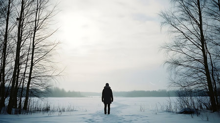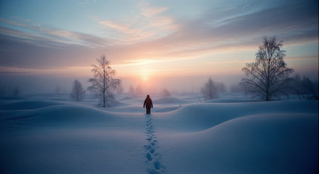 Silhouette on the snow plain . Winter snowy nature . Walking winter footprints