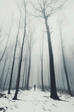 Lonely mighty oak tree in a thick fog after a blizzard. Dramatic sky. Snow-covered field. Nature, environment, ecology, climate change, loneliness, silence concepts. Dark atmospheric landscape