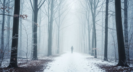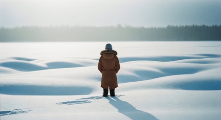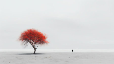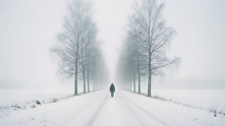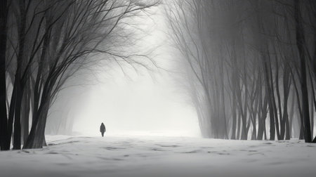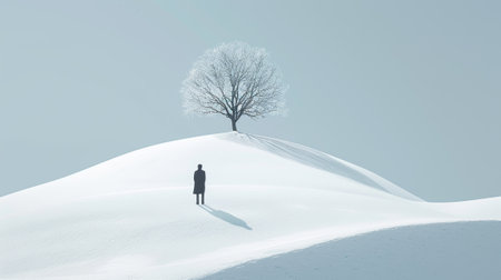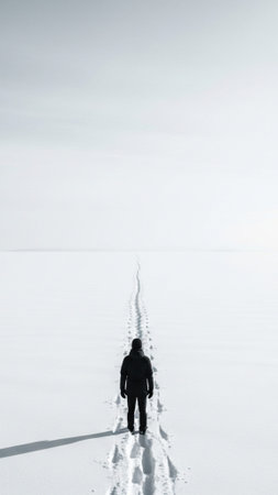 A solitary figure walks across a vast, white landscape. Minimalist and serene.