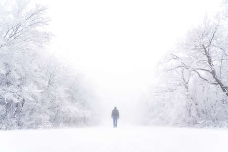 Man in winter on street. Townsman on road. Road is in snow and man.