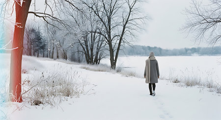 Woman tourist Visiting in Biei, Traveler in Sweater sightseeing Blue Pond with Snow in winter. landmark and popular for attractions in Hokkaido, Japan. Travel and Vacation concept