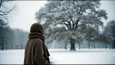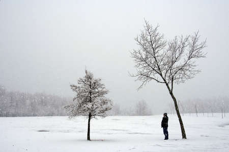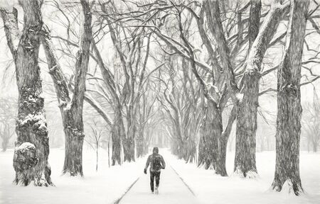 lonely male figure walking in a blizzard - alley of old elm trees - historical Oval at Colorado State University campus, Fort Collins, a photo with digital painitng filter (charcoal)