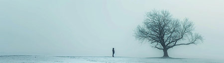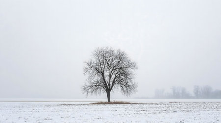 A lone, leafless tree stands in a snowy field shrouded in fog. Serenity and winter's stillness are captured.