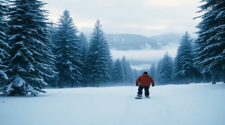 Snowboarder in the winter forest. Snowboarding in the mountains.