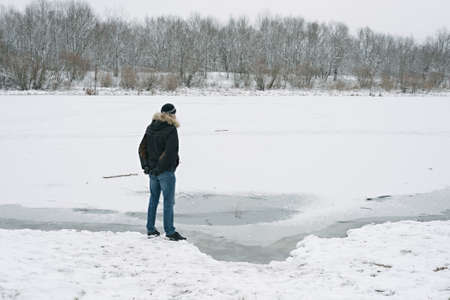 Dangerous thin ice. Man takes risk to step on frozen river surface in winter. Caution. unsafe water. drop possibility