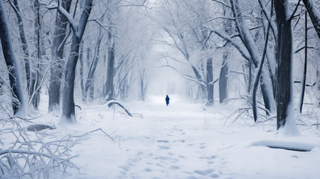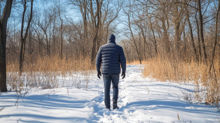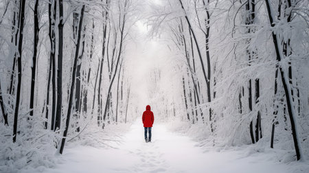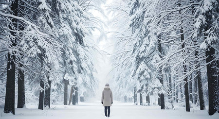 A tourist in a black jacket and blue jeans walks away from the camera along a snowy path surrounded by tall trees in a quiet, snow-covered winter forest. Winter walk through a snowy forest.