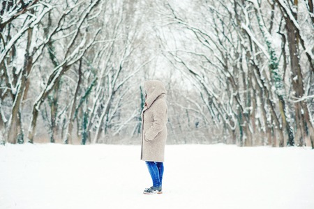 MOSCOW, RUSSIA - FEBRUARY 13, 2019: Girl walk in the park during a snowfall.