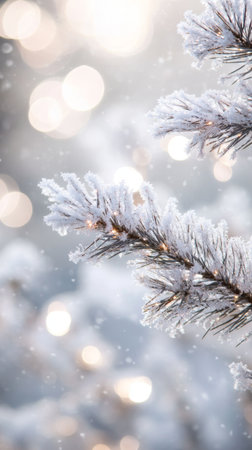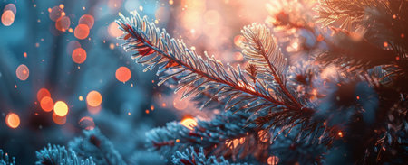 Frozen pine branches covered in sparkling snow against a blurred, light-filled background.