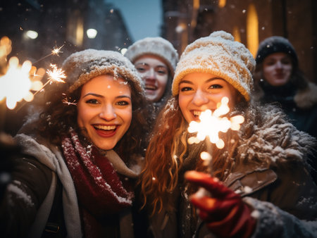A young woman smiles brightly while holding a sparkler, surrounded by friends. The festive atmosphere is enhanced by falling snowflakes in a winter celebration.