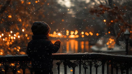 Generative AI Image of Cute Boy Standing Holding Fireworks by the River at Winter Snow