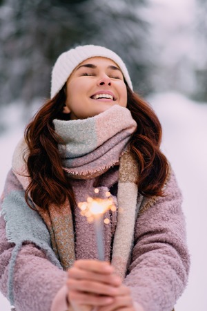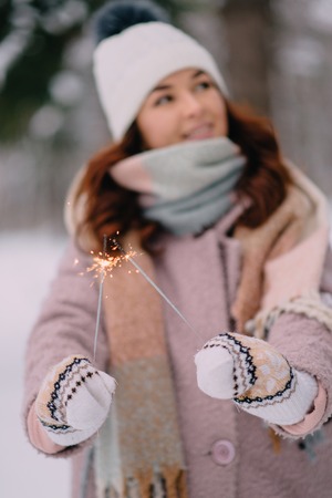 A young woman in warm woolen clothes holds a sparkler in her hands in winter in snowy weather outdoors. High quality photo