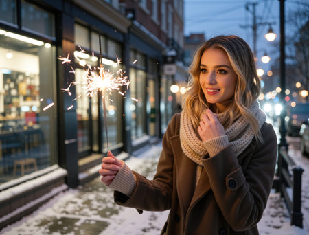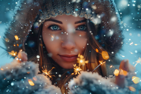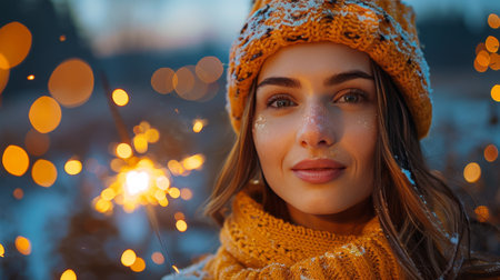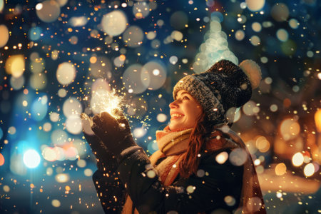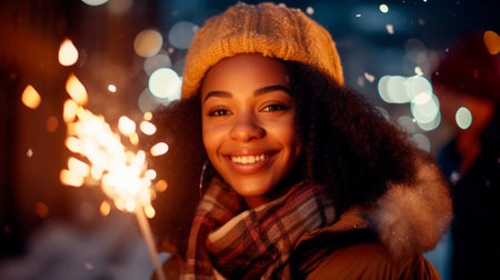 Amidst falling snowflakes, a woman in a cozy hat and gloves beams with happiness while holding sparklers, illuminated by festive lights and the vibrant energy of the winter evening.
