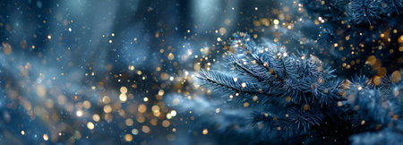 Christmas tree with gold defocused lights and silhouette of spruce branch. defocused new year background with space for text