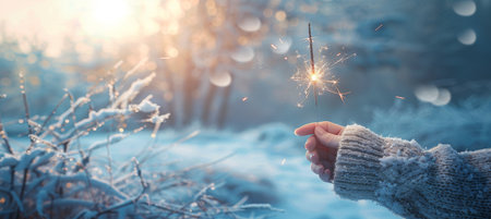 A serene winter scene featuring a hand holding a sparkler above a small tree covered in snow, creating a magical atmosphere in the tranquil forest at twilight.