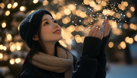 Young Woman Throws Snowflakes, Creating Magic Amidst the Festive Glow of Twinkling Lights.