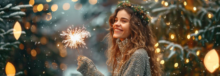 Smiling woman with sparkler in hand wearing festive wreath amidst twinkling holiday lights and snowy trees. Concept of celebration, winter festival, joy, festive mood. Copy space. Christmas, New Year.