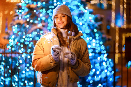 Happy woman burns sparkler by holiday illumination on new years eve while holds glass of champagne