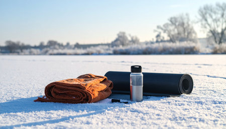 Orange towel, yoga mat, and water bottle rest on a snowy surface under a clear sky.