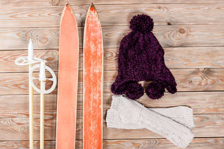 Overhead view of hockey ice skates accessories placed on old rustic wooden table. Items included hockey stick, ice skates, gloves and hat. Winter sport leisure time concept.