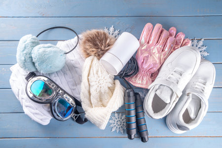 Winter sport and fitness, active lifestyle background. Warm knitted hat, sweater, jump rope, ski mask, thermal mug with hot tea, gloves, winter sneakers on wooden blue background, snowflakes, top view
