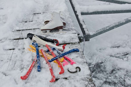 Kids ice skates with adjustable size and accessories on the wooden floor. Accessories for winter sports.