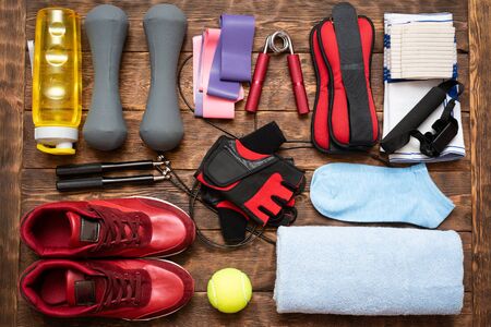 Different Type Of Sports Equipment On Wooden Desk Against White Wall