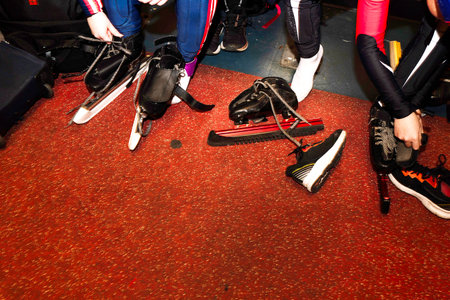 ice hockey sport background with player equipment and equipment on ice hockey rink