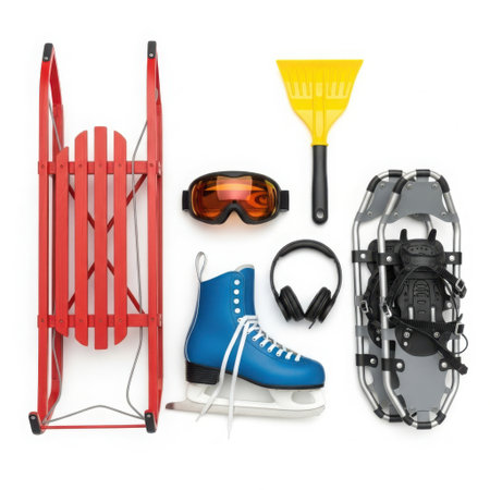 This image showcases a collection of winter sports gear, including a red sled, a pair of blue ice skates, snowshoes, ski goggles, headphones, and a yellow ice scraper. Each item is essential for various winter activities, ensuring safety and enjoyment in cold weather conditions.