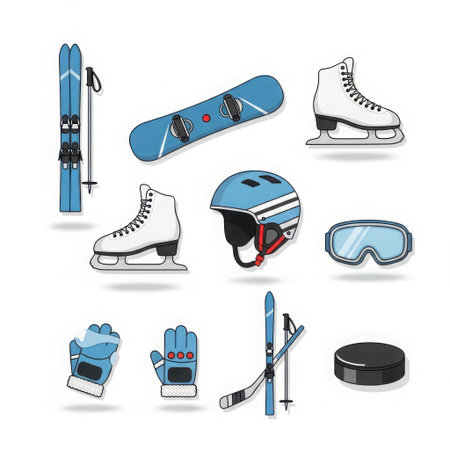 This vibrant arrangement of ski gear features sleek skis, stylish goggles, a protective helmet, and related accessories on a light background. Perfect for winter sports enthusiasts.