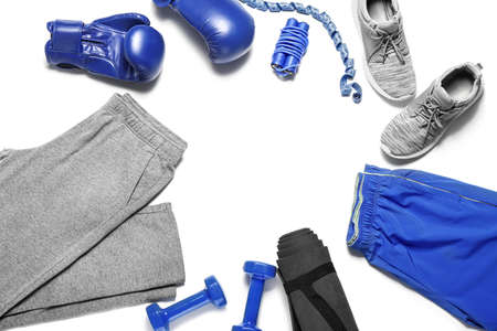Flat lay composition of Sports equipment, clothes on white background. Fitness, sport and healthy lifestyle concept. top view