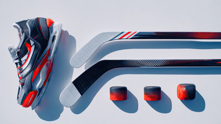 A modern hockey equipment display featuring vibrant skates, sleek sticks, and colorful pucks on a minimalist surface, perfect for sports enthusiasts.