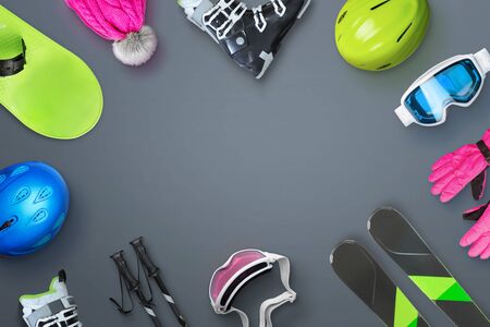 Ski and snowboard equipment placed on the table with copy space in the middle for text, logo or product promotion. Top view, flat lay.