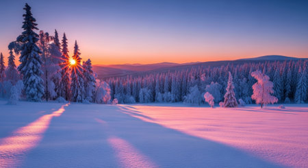 A serene winter landscape at sunset with snow covered fir trees and a vast snowy field. The sun casts long shadows and warm hues of orange, pink, and purple across the pristine snow.