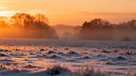 An AI illustration of a scenic field of grass covered in frost illuminated by the setting sun