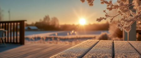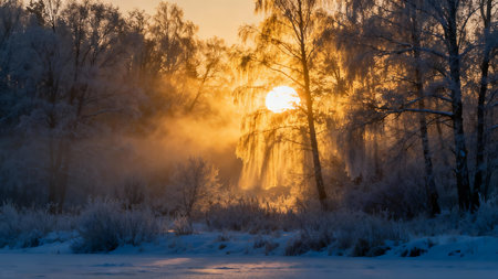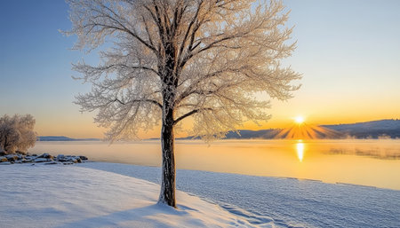 A beautiful sunrise over a snowy landscape, highlighting frosted branches and reflecting light