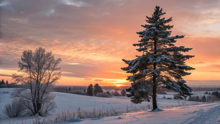 Beautiful winter landscape with snow-covered field and trees at sunset