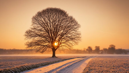 A bare tree stands beside a snowy path as the sun rises, its warm light piercing through the intricate branches, casting a serene glow over the frosty...