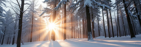 Sunbeams illuminate a panoramic winter forest scene, casting long shadows on the snow.