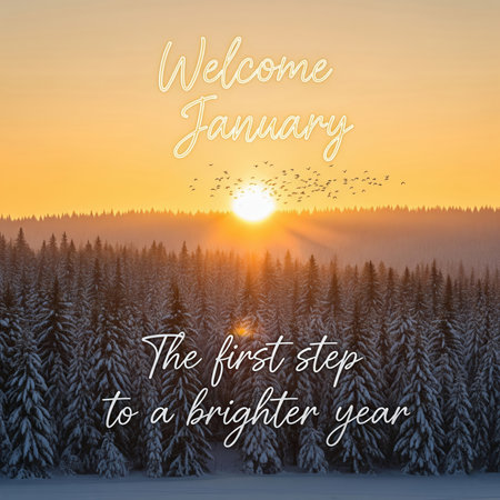 A breathtaking sunrise illuminates a dense forest of snow-covered pine trees. The golden sun peeks over the horizon, casting long rays of light through the misty air. A flock of birds flies across the sky. The text Welcome January and The first step to a brighter year is overlaid on the image, conveying a message of new beginnings and hope for the year ahead.