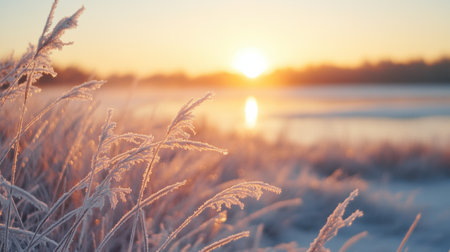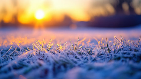 A stunning view of frosty grass sparkling in the early morning light, creating a tranquil winter landscape filled with beauty and warmth under a vibrant sunrise.