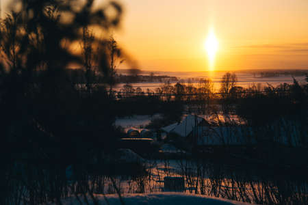 A rare atmospheric phenomenon is the solar light pillar. Beautiful morning winter landscape. Open space and fields at dawn. Good weather. Anomaly. Orange sun and sky. Environment and nature. Horizon.