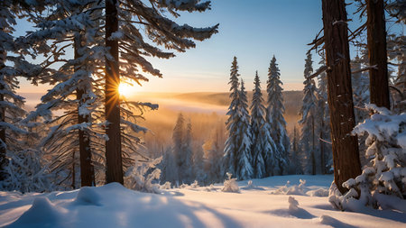 A serene winter forest scene at sunrise, featuring tall snow-covered pine trees standing in a snowy landscape. The sunlight filters through the trees, casting a warm glow on the frosty forest floor. Mist and fog add a soft, ethereal to the scene, creating a peaceful and tranquil atmosphere. The snow-covered branches and trunks of the pine trees create a contrast with the golden light of the rising sun, highlighting the natural beauty and stillness of the winter landscape.