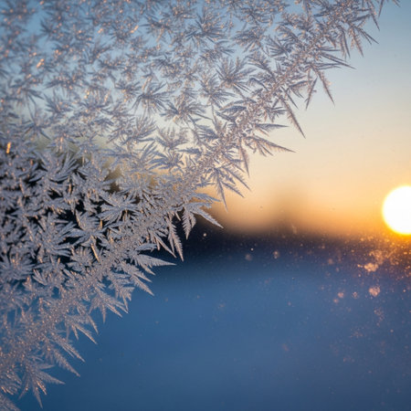 Frosty snowflakes glisten in the dawn light, forming an enchanting winter view filled with intricate crystal patterns and serene colors.