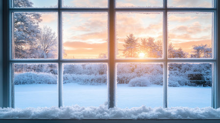 A Breathtaking Winter Sunrise Over a Snow-Covered Landscape with Glimmering Ice Patterns on Glass