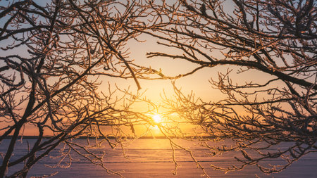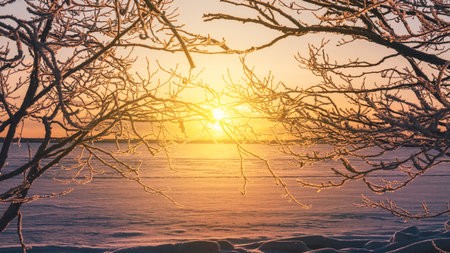 Frosty branches frame glowing sunrise over frozen landscape. Golden light creates serene winter horizon with icy detail