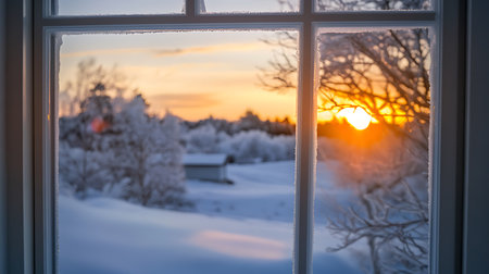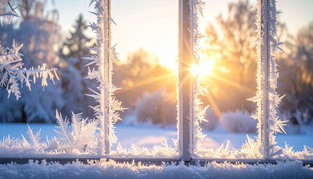 A stunning winter morning view captured through a frosted window showcasing a serene snowy landscape illuminated by the golden light of a rising sun.