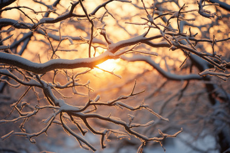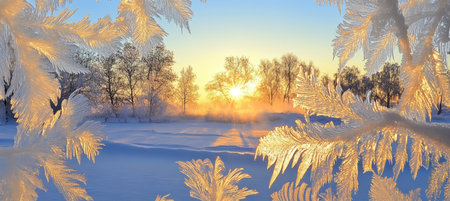 A beautiful sunrise over a snowy landscape, highlighting frosted branches and reflecting light