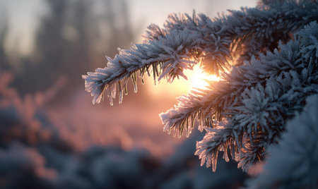 Delicate pine needles coated in frost sparkle under a gentle, amber morning glow, contrasting against a softly blurred winter forest blanketed in snow.