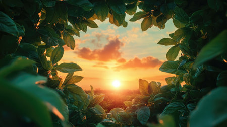 A stunning view captures a vibrant sunset framed by lush green leaves, showcasing a beautiful play of colors in the sky, perfect for nature lovers.