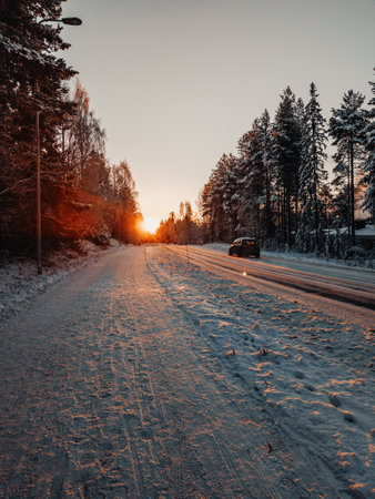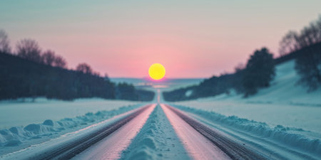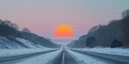 AI Generated. A snowy road with a bright orange sun in the sky